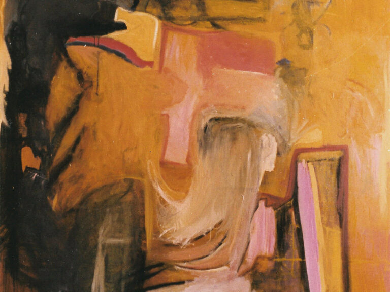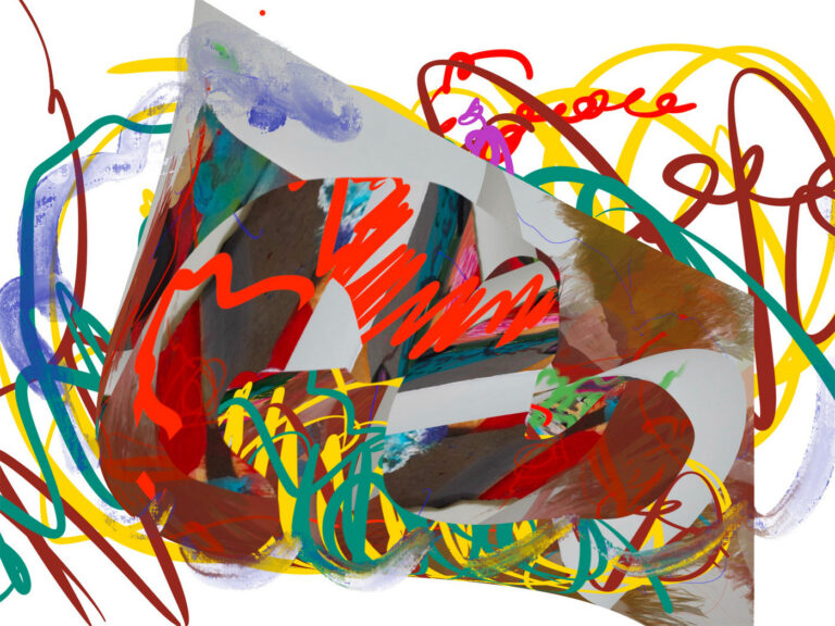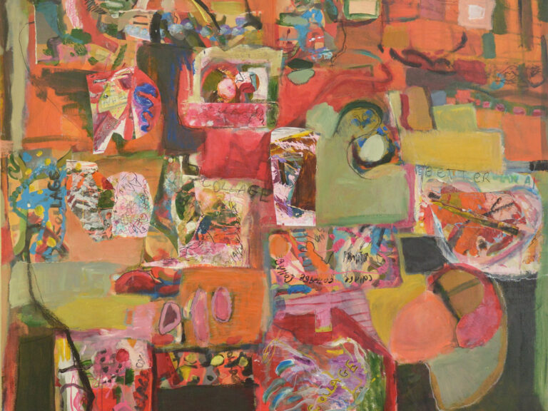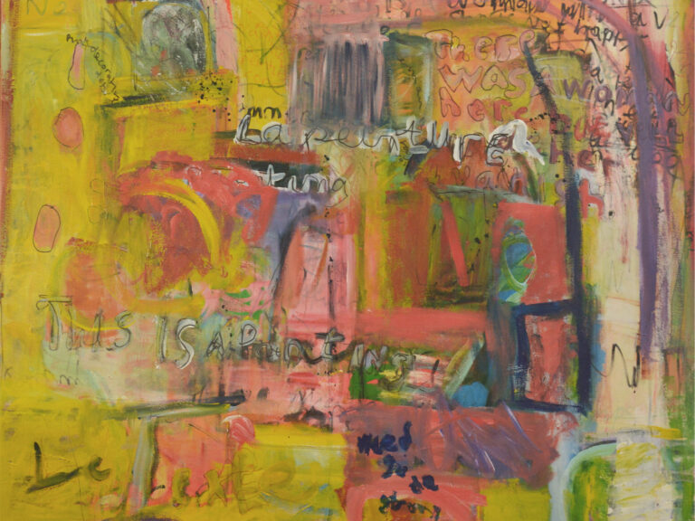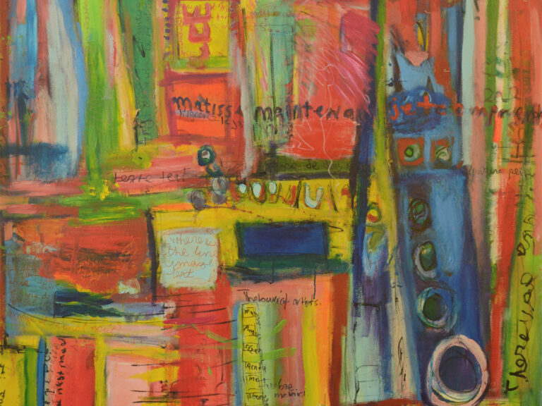 “I paint what happens when structure and instinct collide. Layers build up and push back against each other. Chaos usually ensues.” – Adrienne Fonda
